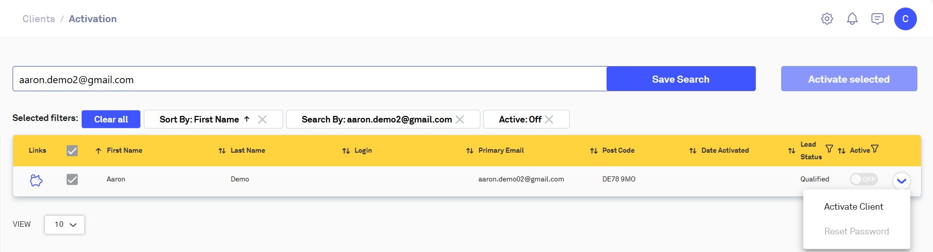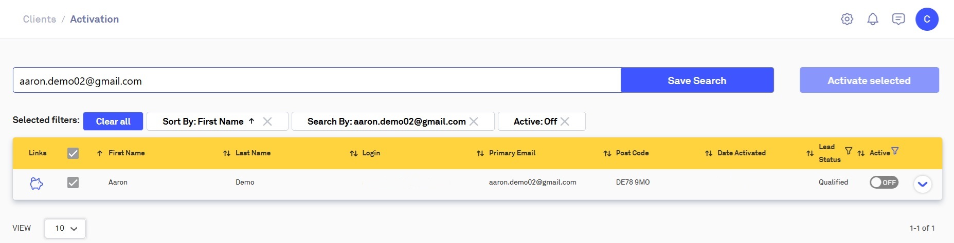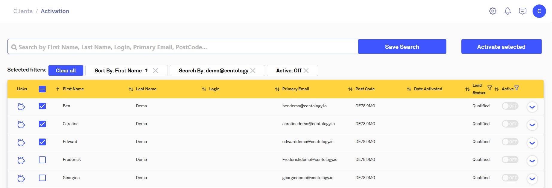 The Activation page will only show clients who have not been activated on the Centology Portal, to change this, amend or remove the filter on the 'Active Column':