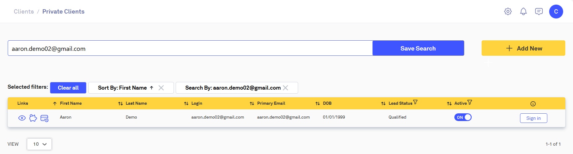 This will take you to the Private Clients page. Here you can search for clients by their name and/or email address, and deactivate their Centology Portal record: