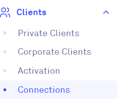 To check whether a Connection has been set up properly, open the Navigation Bar and click on 'Clients', then from the dropdown menu, select 'Private Clients':