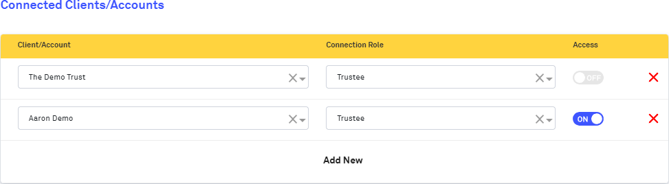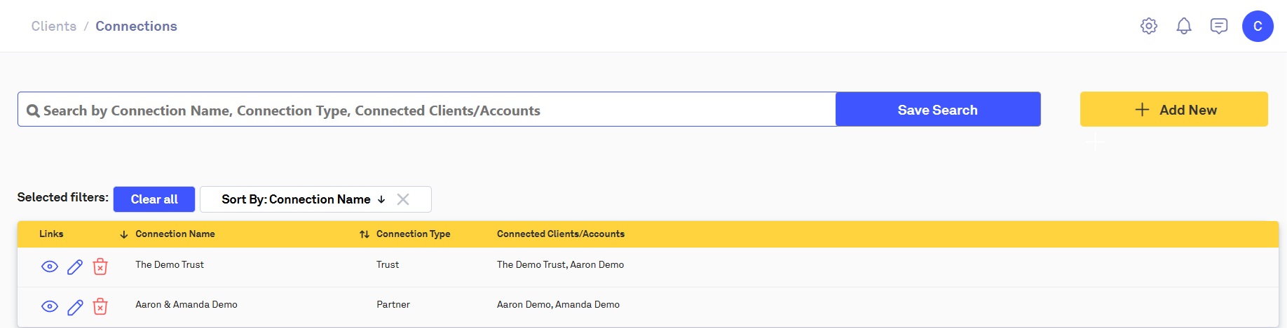 The Connections page is used to link separate client accounts together for Partner, Trustee, or Lasting Power of Attorney access.