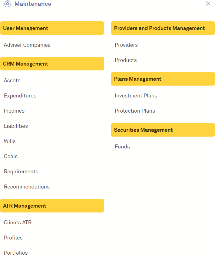 Within the Maintenance Panel, there are various areas where you can update a range of entities or records in Centology which influences the Centology CRM system, ATRs, securities, plans and the fundamental data that informs the front end of Centology. Clicking on any of these options will direct you to the respective page where you can make the necessary updates.