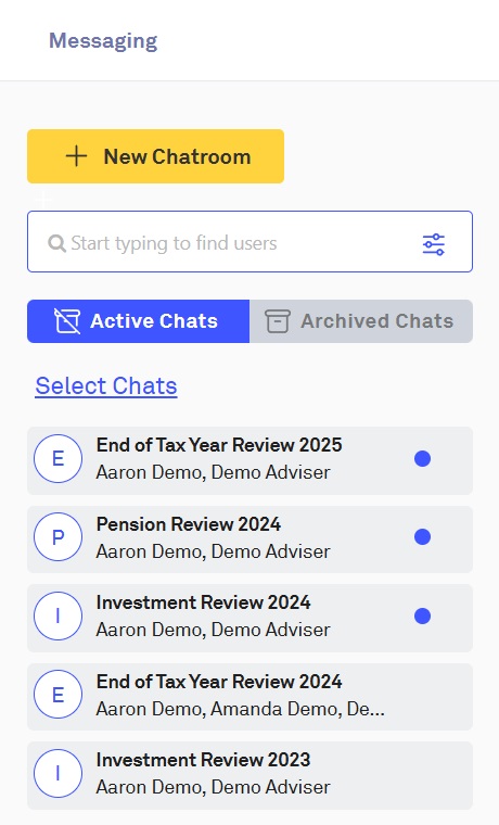 The Centology Chatroom area allows Clients, Advisers, and Adviser Administrators to easily communicate with one another in a safe and secure manner, as well as exchange forms and documents.
