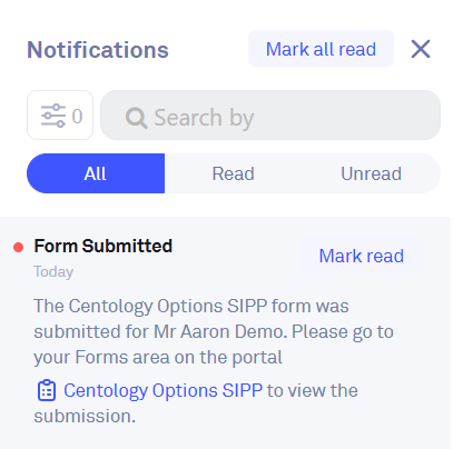 For Adviser Administrators, the Centology Portal notifies you every time one of your clients submits a Published form: