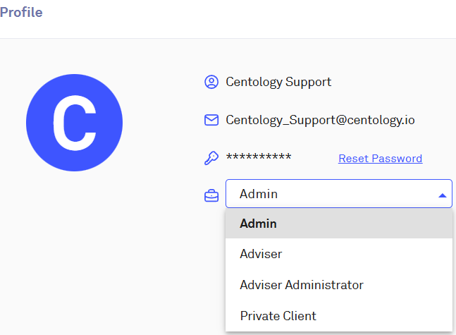 Here you can reset your password and change your profile to a Private Client, Adviser, Admin, or Adviser Administrator, depending on which specific user roles you have in the Centology Portal.