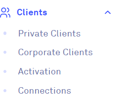 Clicking on 'Clients', will produce a dropdown menu where you can select from the following options: