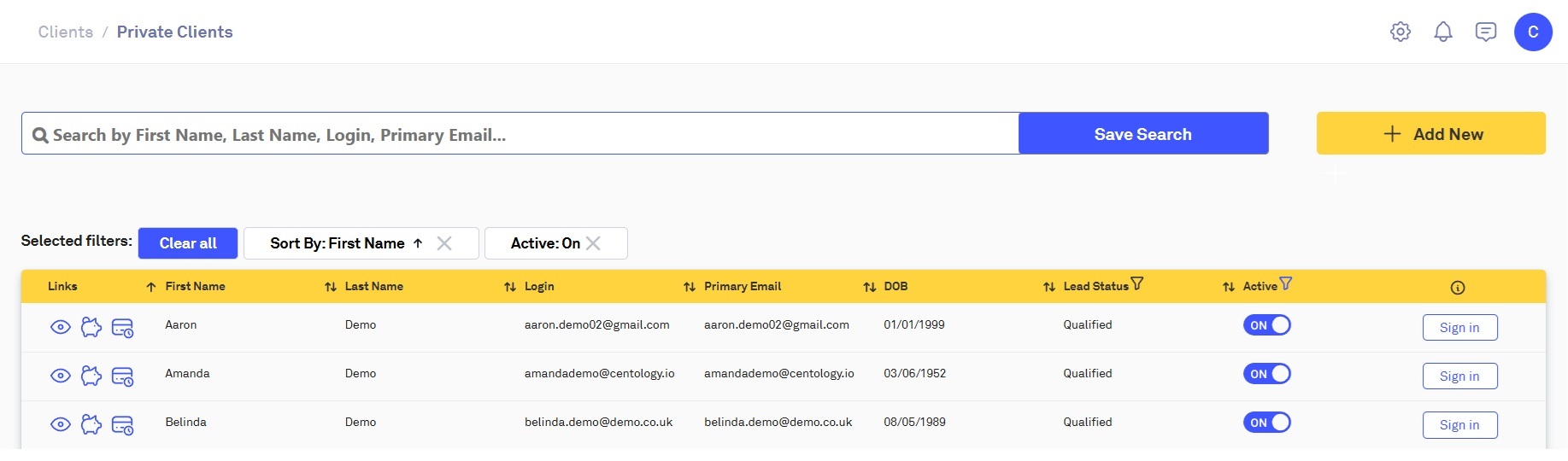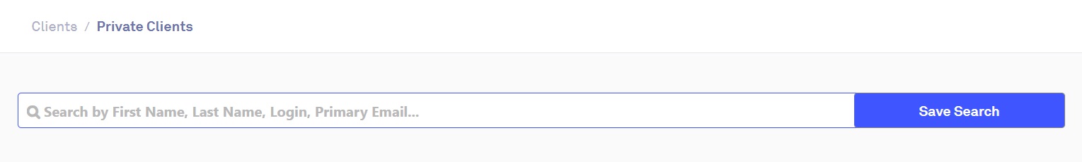 Within the Private Clients page, you can search for clients through the search bar via first name, last name, or email address. Press the 'Enter' key on your keyboard, or click on the 'Save Search' button to search for a specific client: