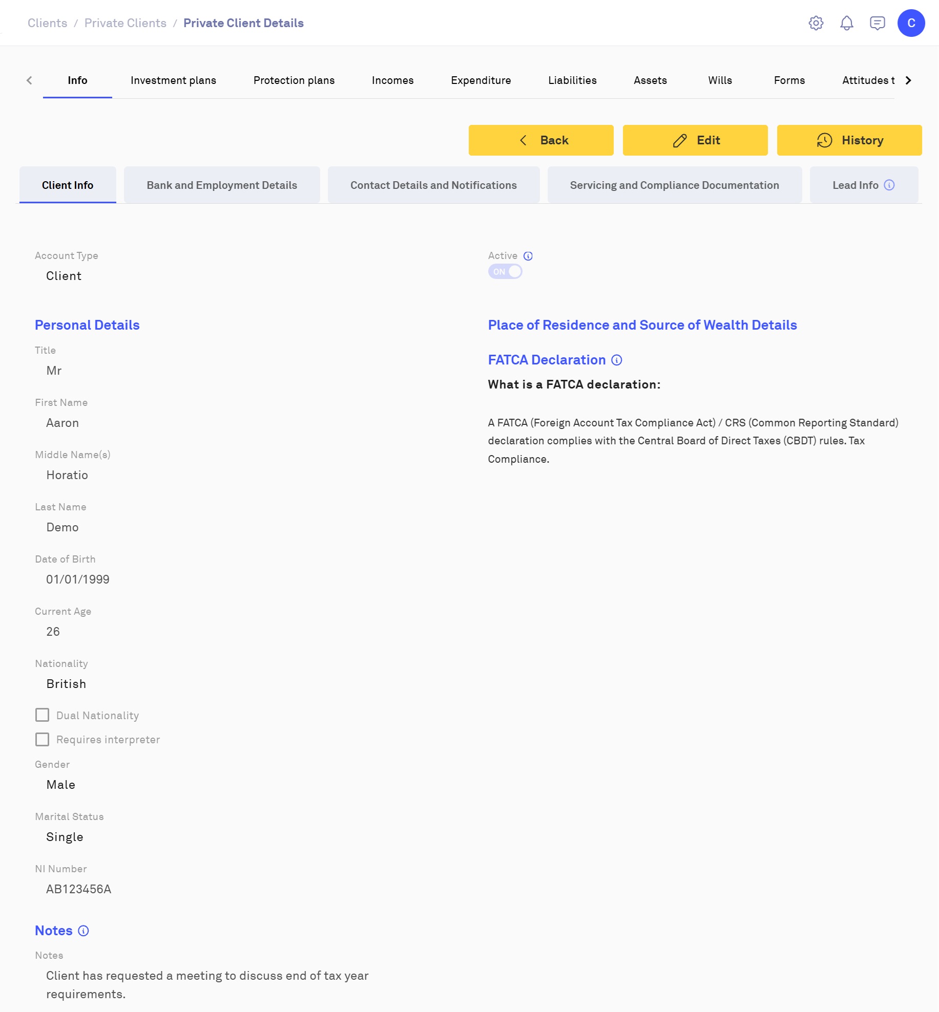 Additionally, you can also access and update the client's Plans, Assets, Liabilities, Income and Expenditure.