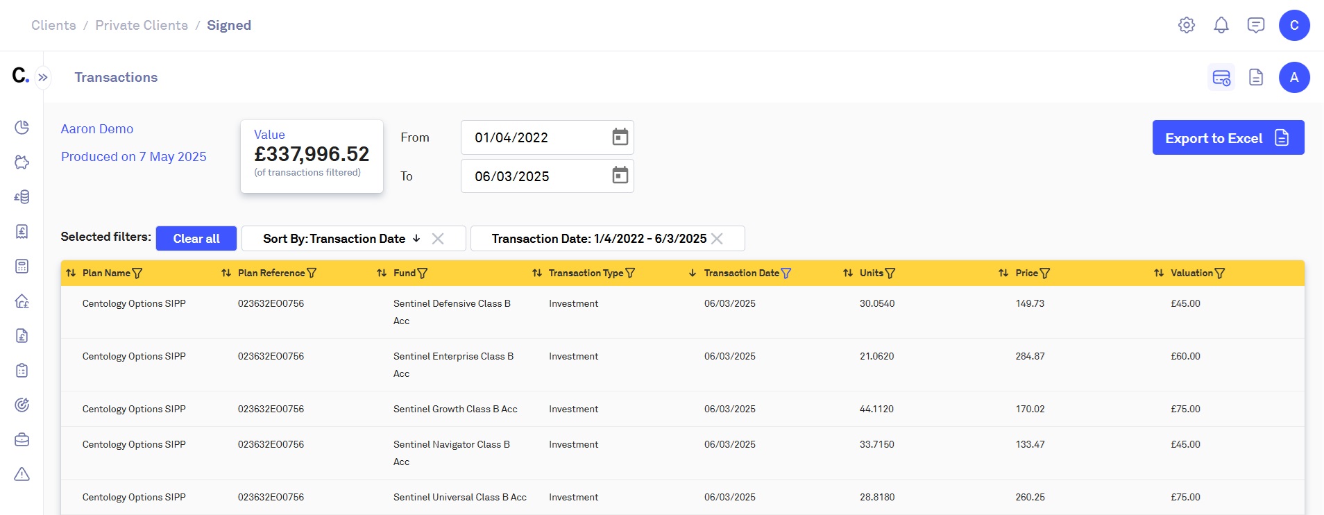 The Centology Portal's Transaction History allows you to view the transactions to date for a given client's plans.