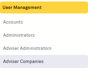 Before creating an Adviser, you must first create an Adviser Company, for information on how to do this please read: Creating an Adviser CompanyStep 1: